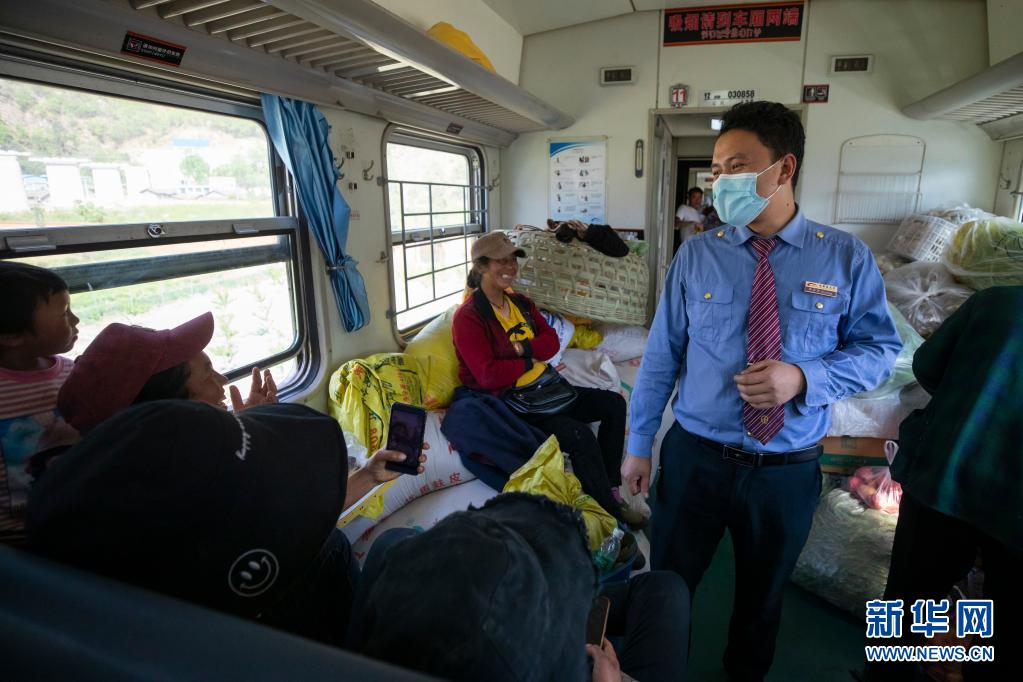 中國(guó)鐵路成都局集團(tuán)公司成都客運(yùn)段5634次列車(chē)員吉木阿且(右一)在車(chē)廂里與彝族乘客交流(4月12日攝)。5633/5634次列車(chē)配備了6名彝族列車(chē)員,以更好地為當(dāng)?shù)匾妥灏傩辗?wù)。新華社記者 沈伯韓 攝