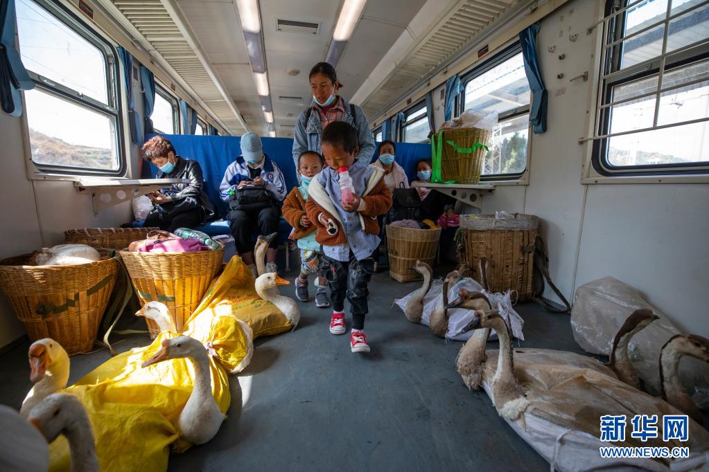在5633次列車上,小朋友走過(guò)兩邊放著家禽的車廂(4月11日攝)。新華社記者 沈伯韓 攝