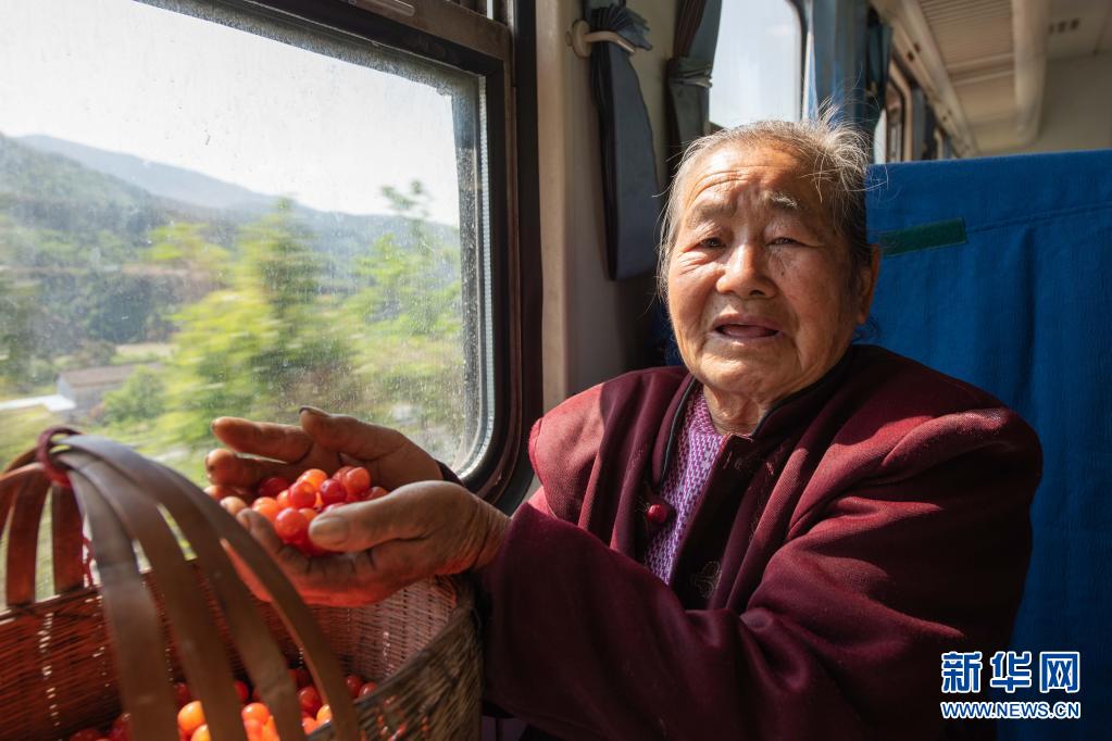 冕寧縣村民馬光玉帶著自家種的櫻桃前往西昌出售,每天她都會搭乘5633/5634次列車往返西昌和冕寧(4月11日攝)。新華社記者 胥冰潔 攝