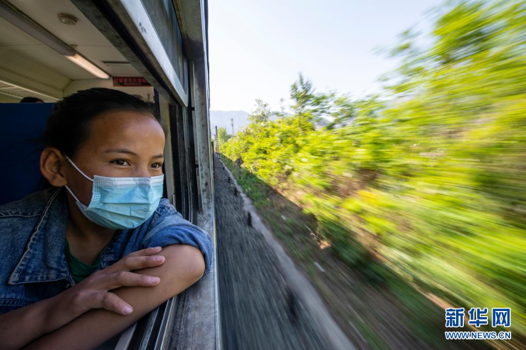 在乘坐5633次列車從家返校途中,一名學生望著窗外的風景(4月11日攝)。新華社記者 沈伯韓 攝
