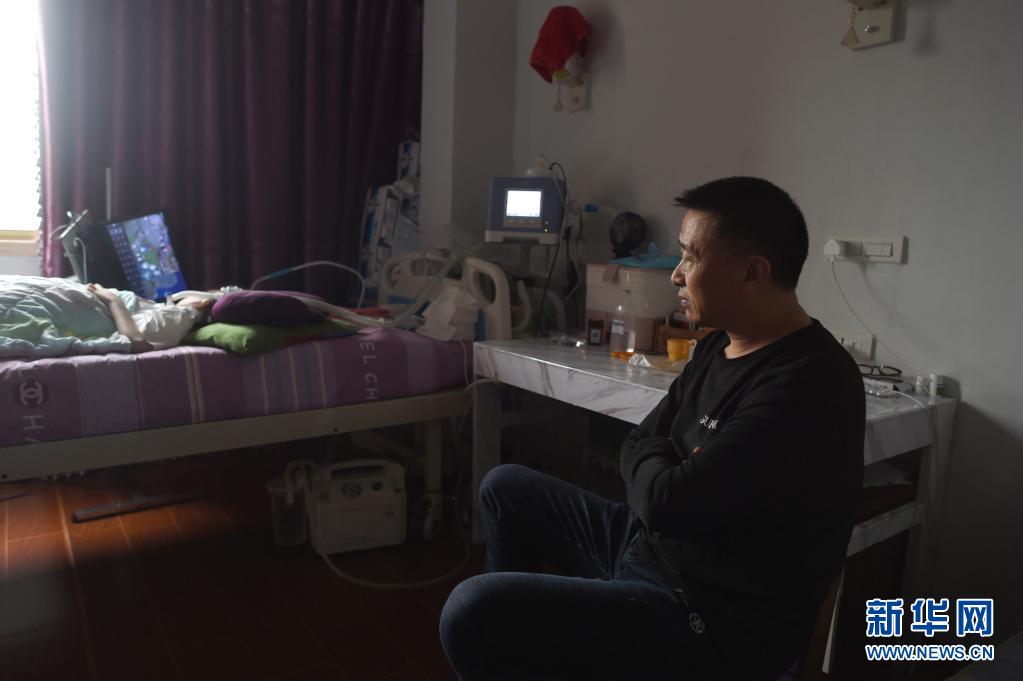 父親包宗鋒坐在床邊隨時“待命”(4月13日攝)。包宗鋒被檢查出腦血管畸形,因為要照看孩子,一直不敢去做手術(shù)。