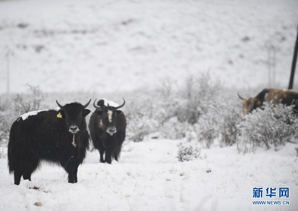 這是4月19日在青海省果洛藏族自治州甘德縣拍攝的雪中的牦牛。新華社記者 張曼怡 攝