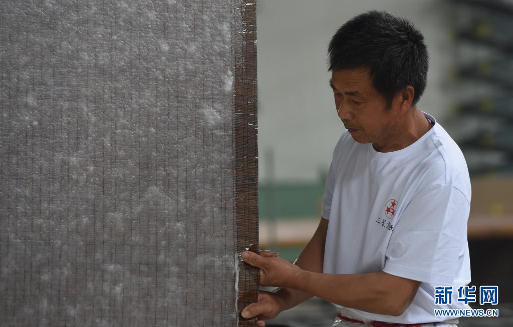 4月22日,在安徽宣城市涇縣“四丈宣紙”生產(chǎn)車間,工人在進(jìn)行放簾作業(yè)。