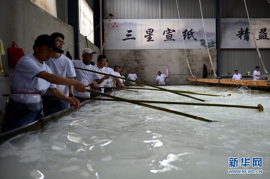 近日,在宣紙產(chǎn)地安徽省宣城市涇縣,“四丈宣紙”的抄制在一家紙業(yè)有限公司啟動(dòng)。50余名撈紙師傅操作巨型紙簾,齊心協(xié)力,在紙槽旁進(jìn)行撈紙作業(yè)。來(lái)回起落兩次,動(dòng)作整齊劃一。隨后工人們將紙簾吊起放至一邊揭下,一張巨大的宣紙便撈制成功。經(jīng)過(guò)曬、剪等工序后, 制成長(zhǎng)13.2米、寬3.6米的巨型宣紙就是“四丈宣紙”。