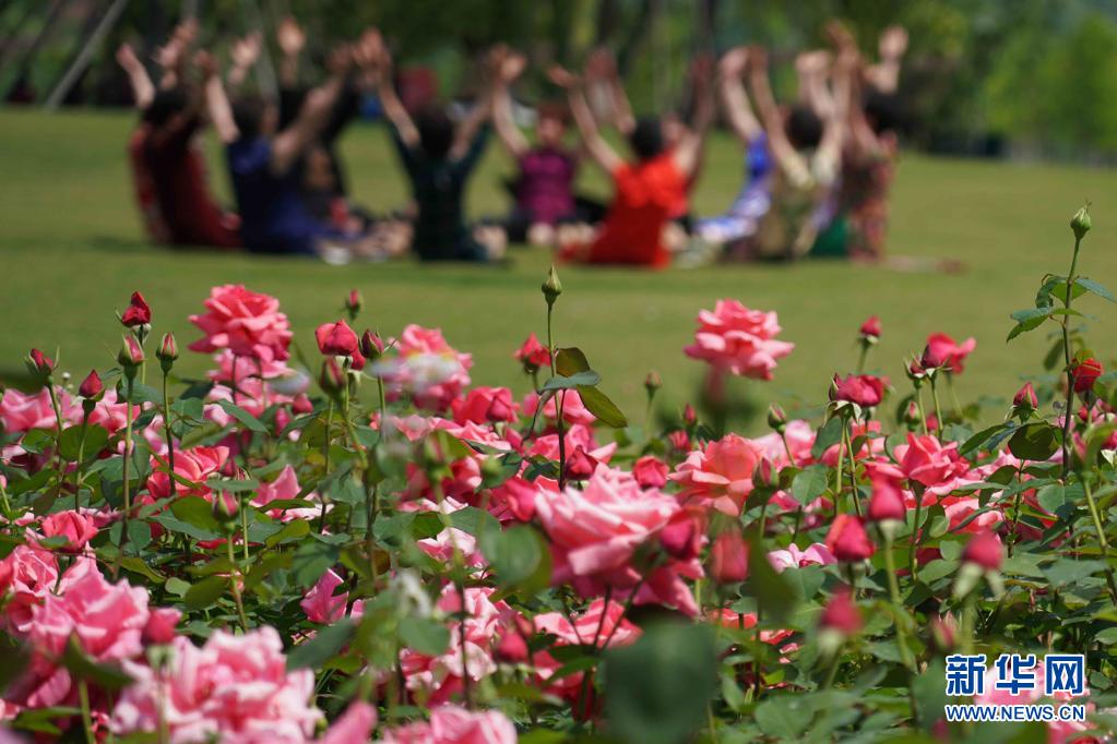 4月26日,市民在杭州濱江白馬湖公園月季園游玩賞花踏青并留影。近日,各地鮮花盛開,吸引人們走出家門踏青賞花。新華社發(fā)(莊穎昶 攝)
