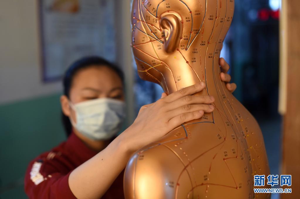4月28日,葉景芬在自己實(shí)習(xí)的龍泉市中醫(yī)院內(nèi)感受中醫(yī)針灸穴位。新華社記者 韓傳號(hào) 攝