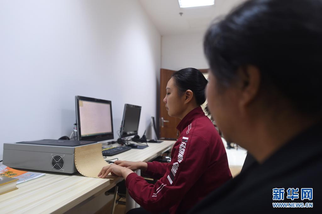 4月28日,葉景芬(前)在媽媽林鳳玉陪伴下,在龍泉市圖書館視障電子閱覽室查閱盲文資料。新華社記者 韓傳號(hào) 攝