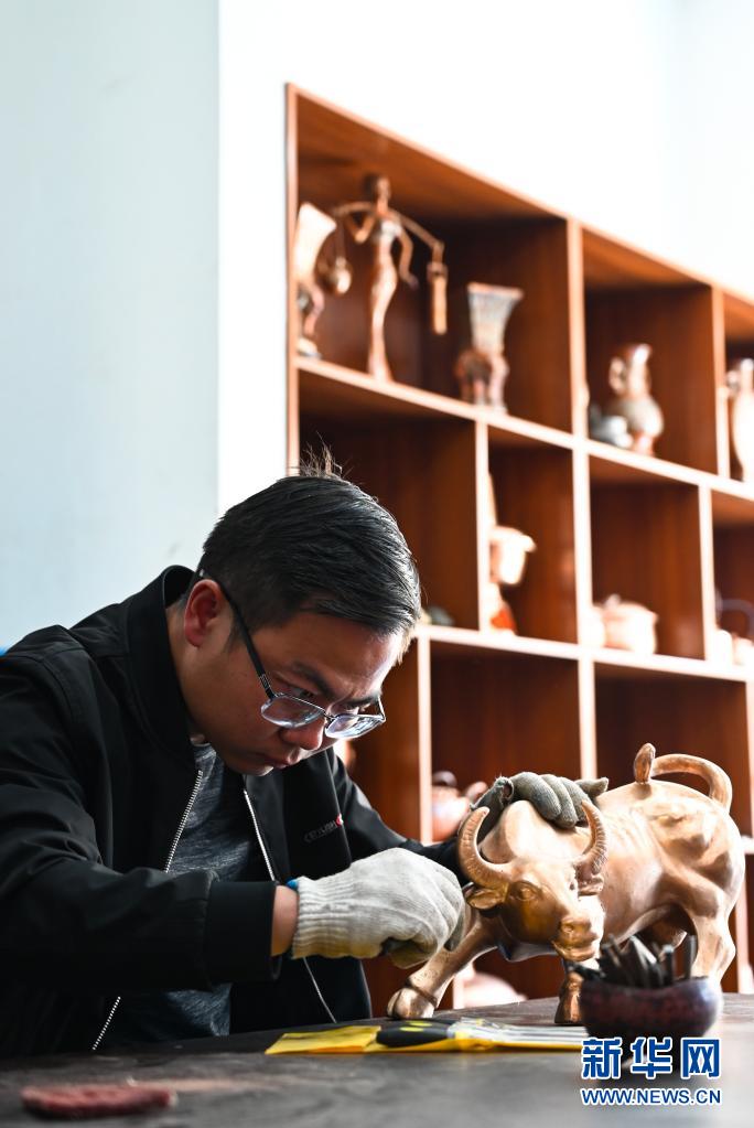 地處滇東北、烏蒙山腹地的云南會澤縣流傳著具有300多年歷史的斑銅制作工藝。斑銅工藝復雜,要采用高品位的銅為原料,經(jīng)過20余道工序制作而成。產(chǎn)品“妙在有斑,貴在渾厚”,風格獨樹一幟。33歲的張偉是會澤“張氏斑銅”的第十三代傳人。自幼深受地域文化和家庭熏陶的他,大學畢業(yè)后,返鄉(xiāng)從事斑銅制作工作。在會澤古城的“銅匠街”,張偉創(chuàng)辦了斑銅傳習館,不斷研發(fā)斑銅新產(chǎn)品、傳承著這項非遺技藝?!鞍咩~是一種情感、一種文化,希望在我們這代人的努力下能夠更好地將它傳承下去,讓更多人了解斑銅的獨特魅力。”張偉說。