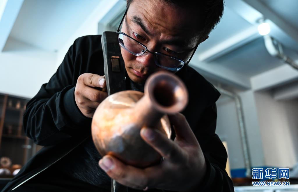 地處滇東北、烏蒙山腹地的云南會(huì)澤縣流傳著具有300多年歷史的斑銅制作工藝。斑銅工藝復(fù)雜,要采用高品位的銅為原料,經(jīng)過(guò)20余道工序制作而成。產(chǎn)品“妙在有斑,貴在渾厚”,風(fēng)格獨(dú)樹一幟。33歲的張偉是會(huì)澤“張氏斑銅”的第十三代傳人。自幼深受地域文化和家庭熏陶的他,大學(xué)畢業(yè)后,返鄉(xiāng)從事斑銅制作工作。在會(huì)澤古城的“銅匠街”,張偉創(chuàng)辦了斑銅傳習(xí)館,不斷研發(fā)斑銅新產(chǎn)品、傳承著這項(xiàng)非遺技藝?!鞍咩~是一種情感、一種文化,希望在我們這代人的努力下能夠更好地將它傳承下去,讓更多人了解斑銅的獨(dú)特魅力?!睆垈フf(shuō)。