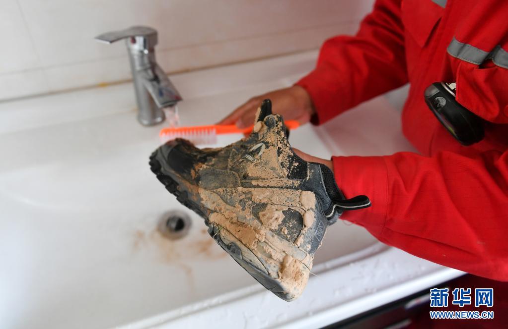 4月28日,巡線隊(duì)員侯勵峰結(jié)束巡線后清洗登山鞋。新華社記者 張博文 攝