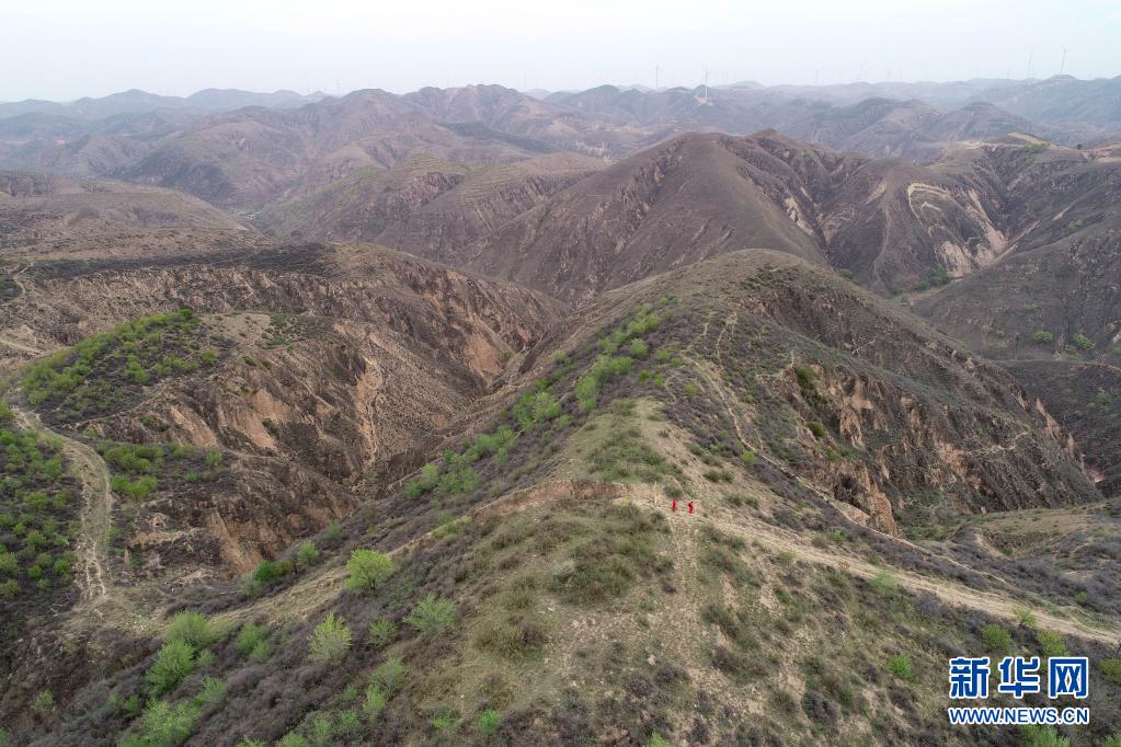 4月27日,延長氣田采氣二廠巡線隊員在巡線途中(無人機照片)。新華社記者 張博文 攝