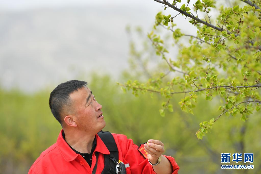 4月27日,巡線隊員張浩軍在巡線途中采摘野生水果補(bǔ)充體能。新華社記者 張博文 攝