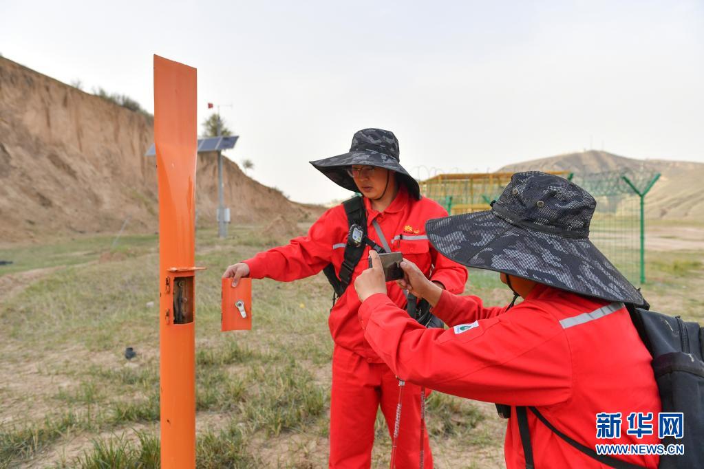 4月28日,巡線隊員侯勵峰、曹碩(左)在巡線途中拍照記錄一處設(shè)置故障。新華社記者 張博文 攝