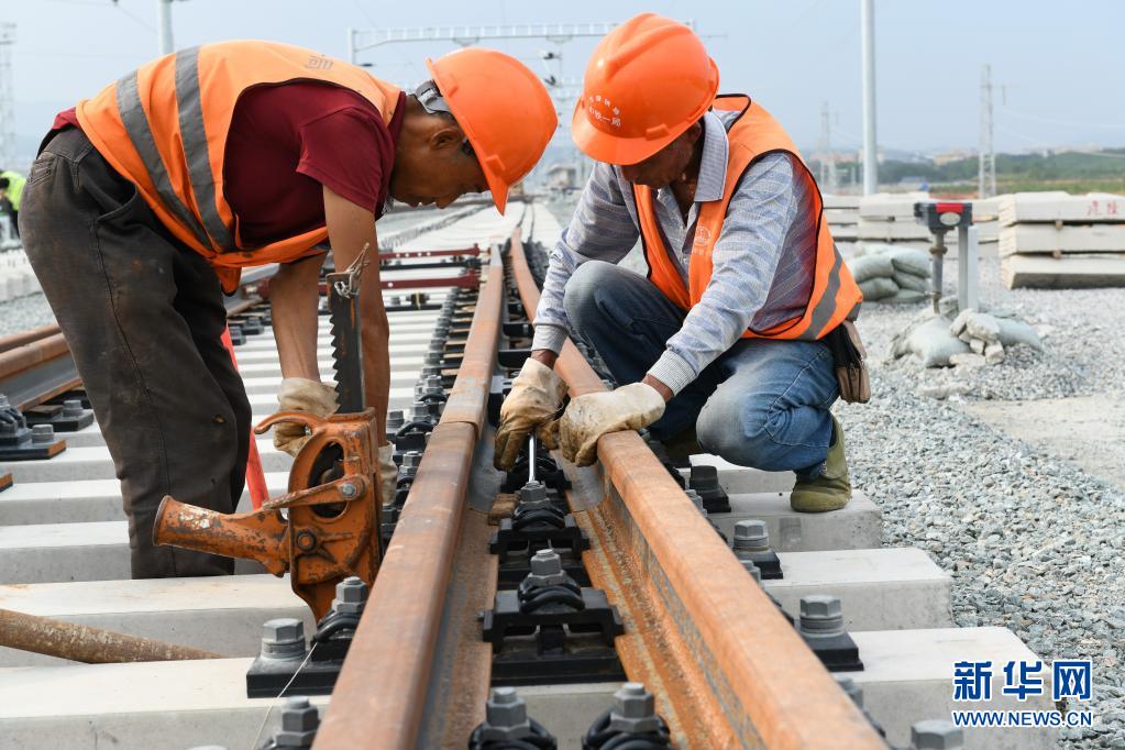 5月1日,工人在中老鐵路國內(nèi)段云南西雙版納火車站工地進(jìn)行鋪軌作業(yè)。