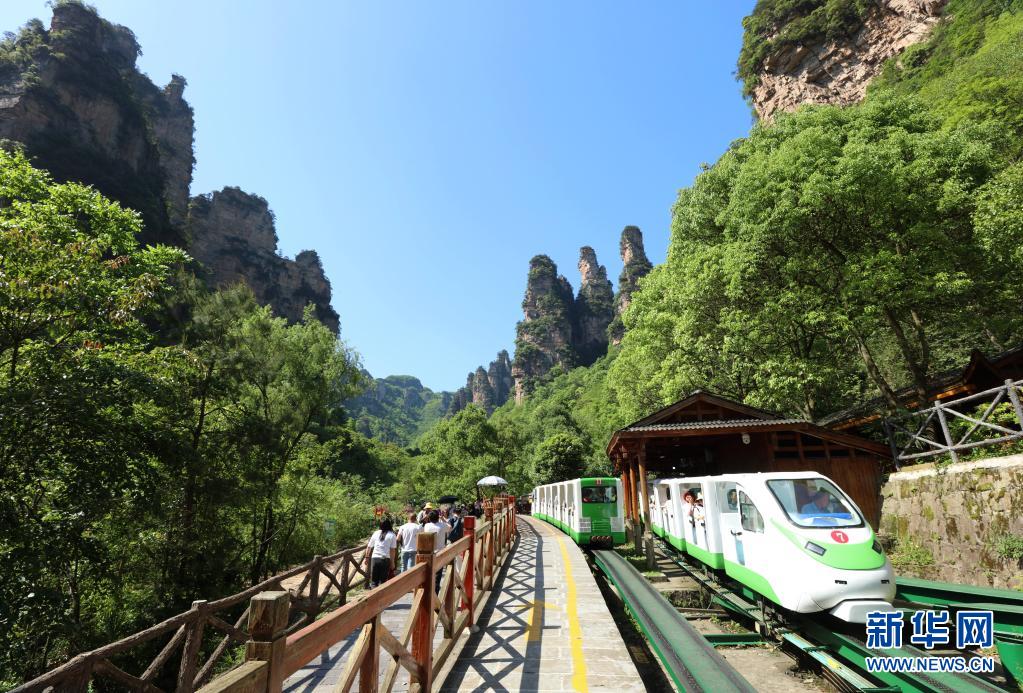 5月1日,游人乘觀光電車在湖南省張家界市武陵源區(qū)十里畫廊景區(qū)游玩。