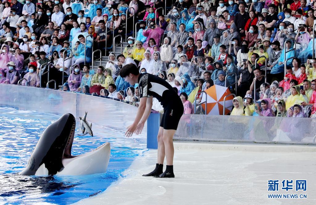 5月1日,飼養(yǎng)員在虎鯨科普秀活動(dòng)中給虎鯨投喂小魚“獎(jiǎng)勵(lì)”。