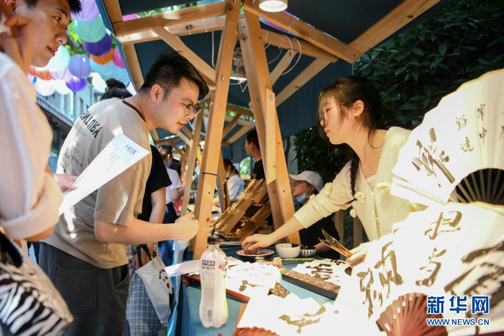 5月1日,游客在四川省成都市寬窄巷子景區(qū)的一家文創(chuàng)商店選購扇子。