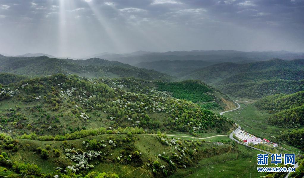 陽光照耀在陜西省寶雞市隴縣關(guān)山草原旅游風(fēng)景區(qū)鮮花盛開的山坡上(5月4日攝,無人機照片)。新華社記者 陶明 攝
