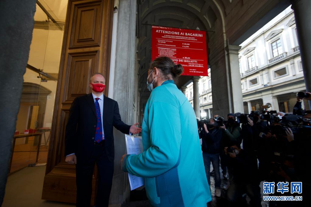 5月4日,在意大利佛羅倫薩,烏菲齊美術(shù)館館長施密特(左)在重新開放的美術(shù)館門口迎接參觀者。當日,意大利烏菲齊美術(shù)館重新開放。美術(shù)館改建了售票處和接待處,以避免排隊,并開設了十四個新展室。新華社發(fā)