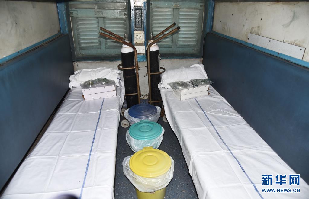 這是5月5日在印度高哈蒂火車(chē)站拍攝的改造成臨時(shí)病房的列車(chē)廂。