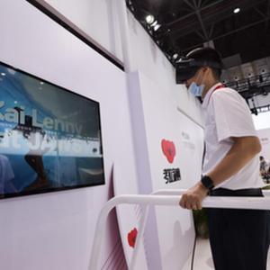 5月7日,觀眾在消博會現(xiàn)場體驗VR沖浪。