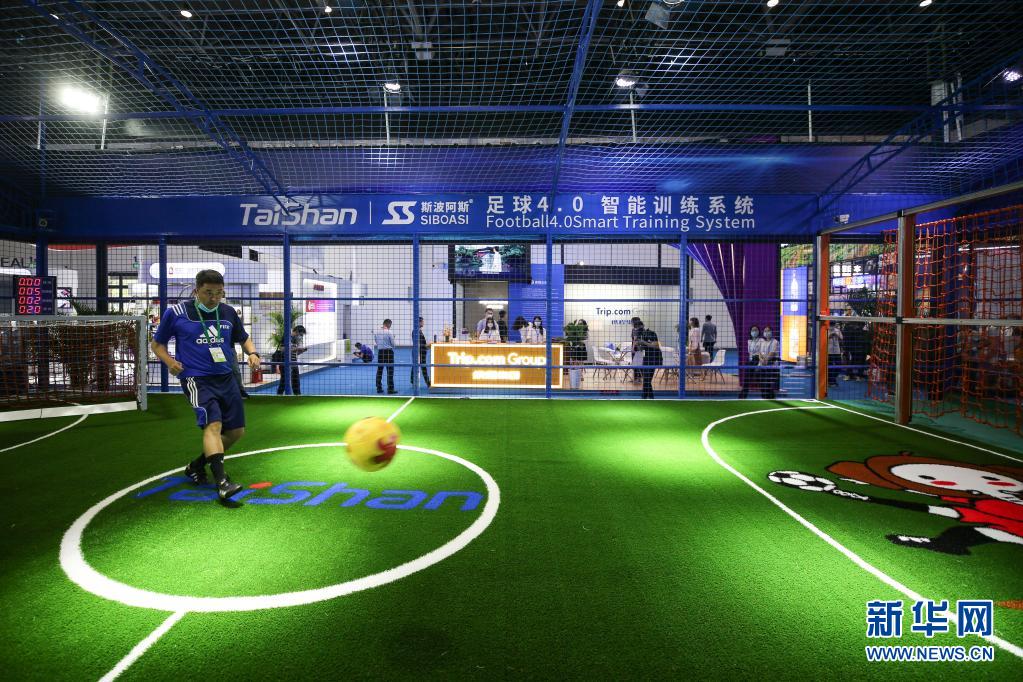 5月7日,參展商在消博會現(xiàn)場演示足球智能訓練系統(tǒng)。