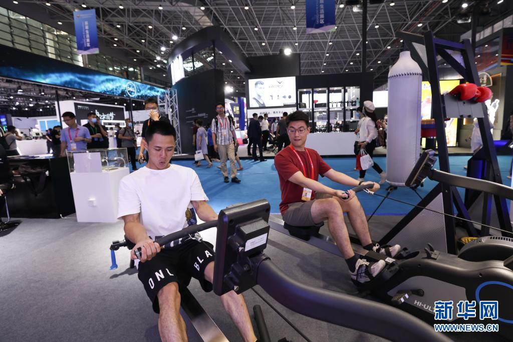 5月7日,觀眾在消博會(huì)現(xiàn)場體驗(yàn)劃船機(jī)。