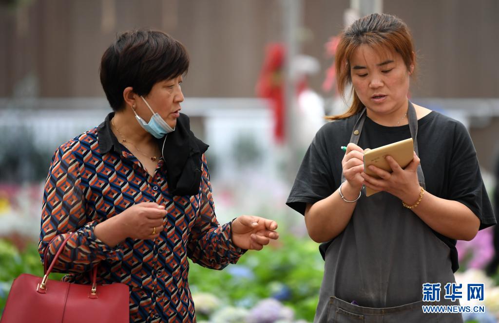 5月7日,在秦嶺花世界現(xiàn)代農(nóng)業(yè)園區(qū),銷售人員在給顧客計算花卉價格。