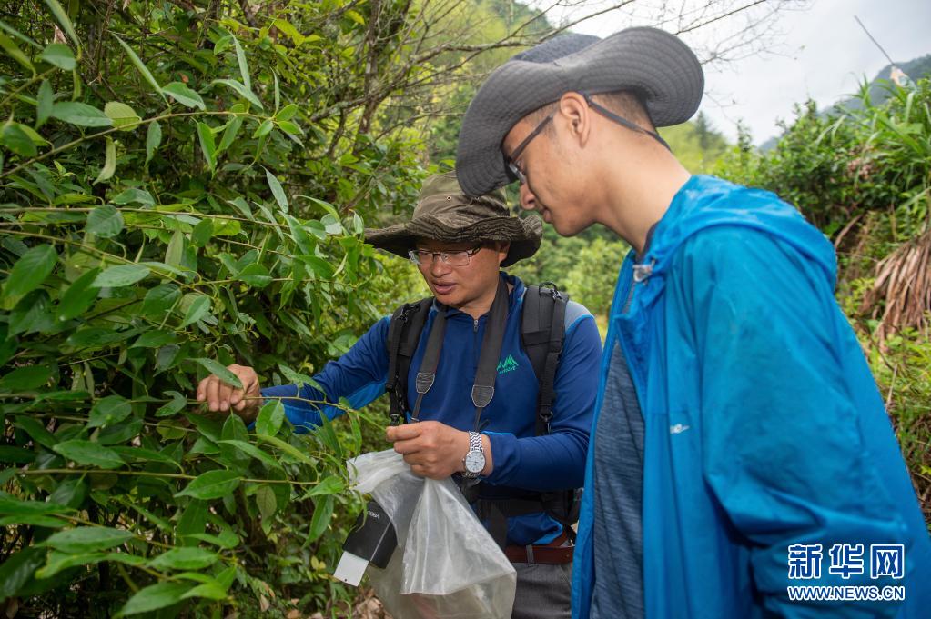 5月11日,中國計量大學植物生態(tài)學教授孫俊威(左)與參與此次調查的助理劉煜坤一起采集植物標本。