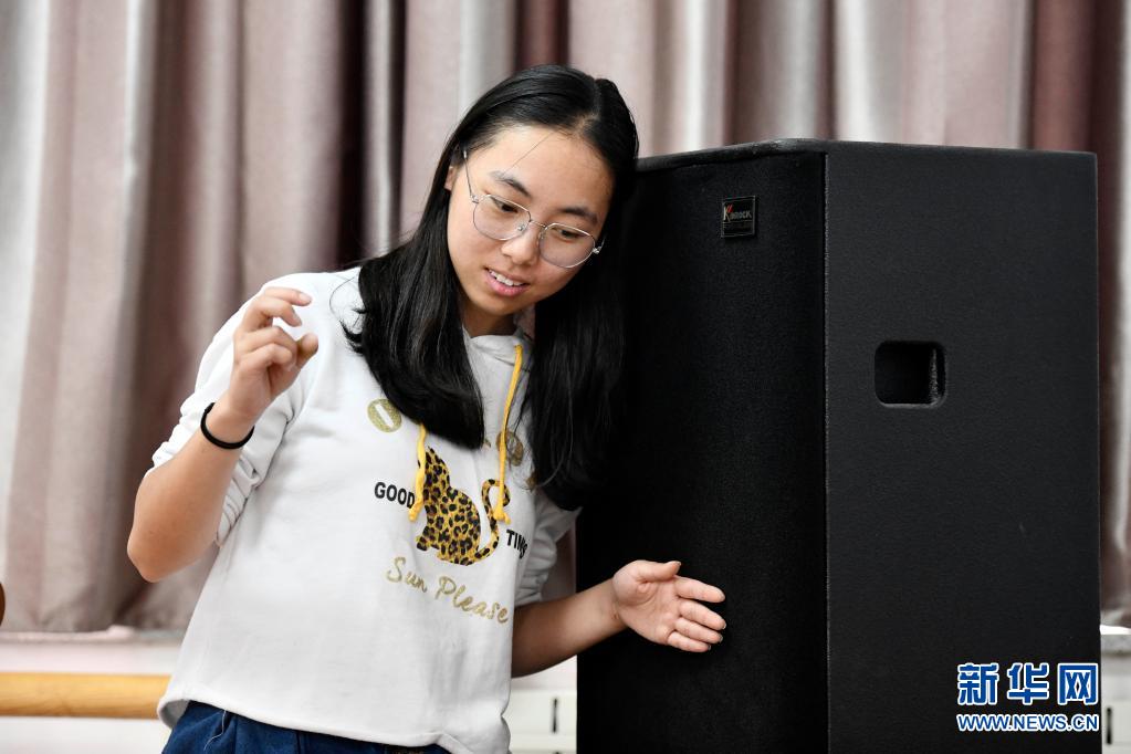 天津理工大學(xué)聾人工學(xué)院聾人舞蹈隊(duì)隊(duì)長楊凝在排練時(shí)用手接觸音響感受震動(5月12日攝)。新華社記者 趙子碩 攝