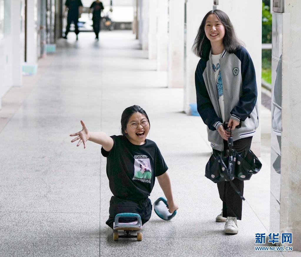 2021年5月10日,蔣張子怡(左)和同學(xué)在學(xué)校的走廊聊天。