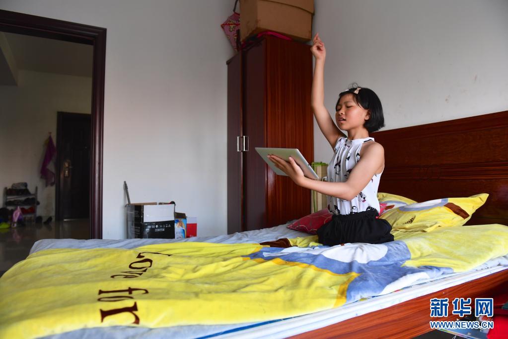 2017年5月17日,下課回家后,蔣張子怡在床上利用平板電腦學習舞蹈。
