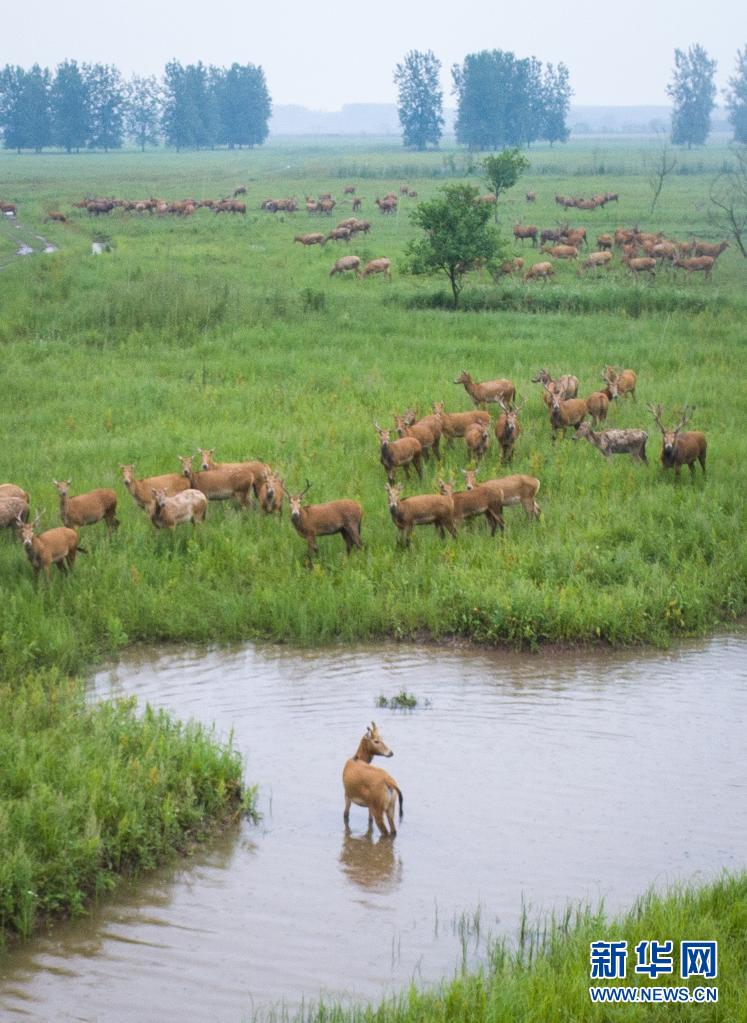 5月17日,一群麋鹿在石首麋鹿國家級自然保護(hù)區(qū)內(nèi)活動(無人機(jī)照片)。新華社記者 肖藝九 攝
