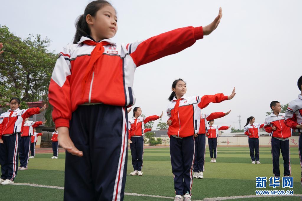 5月19日,邢臺市內(nèi)丘縣實驗小學學生在操場上練習武術操。