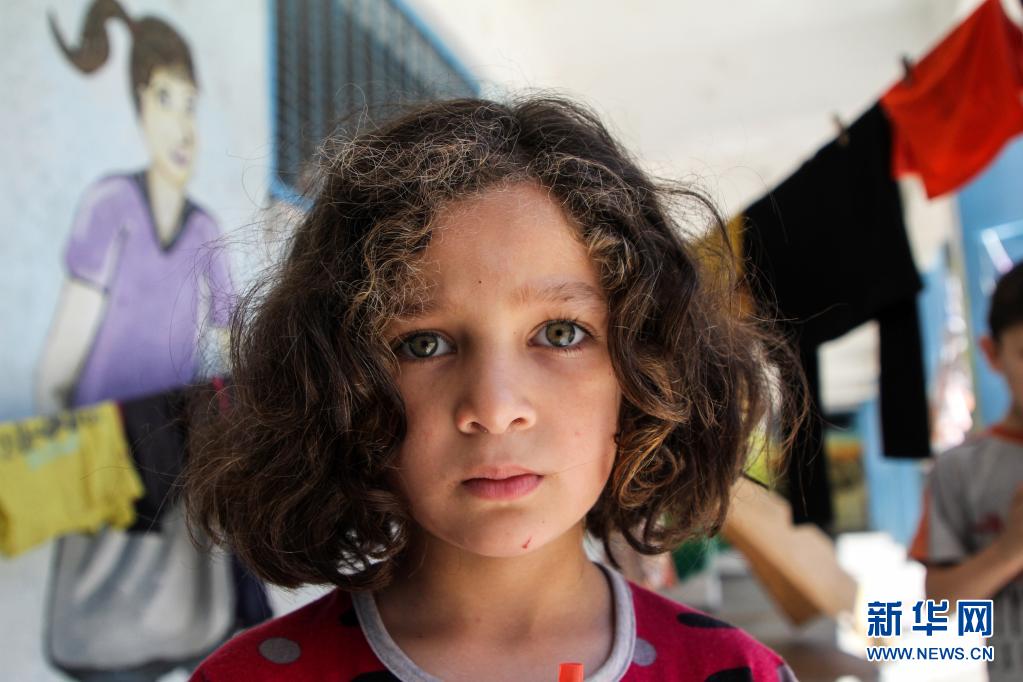 5月19日,受空襲影響而逃離家園的5歲巴勒斯坦兒童薩馬·蘇丹在加沙城的一所學(xué)校臨時(shí)棲身。