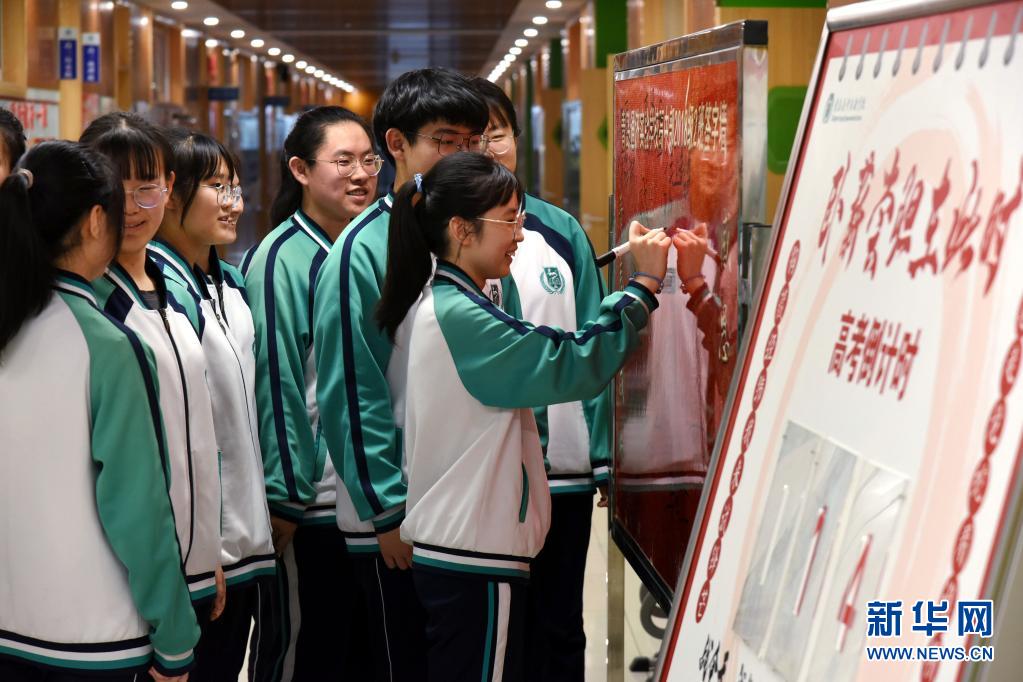 5月23日,青島通濟(jì)實(shí)驗(yàn)學(xué)校高三學(xué)生在簽名板上留言相互鼓勵(lì)。
