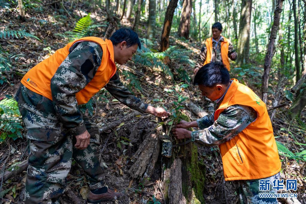 護(hù)林員楊有山(右一)和同事在布設(shè)紅外相機(3月15日攝)。