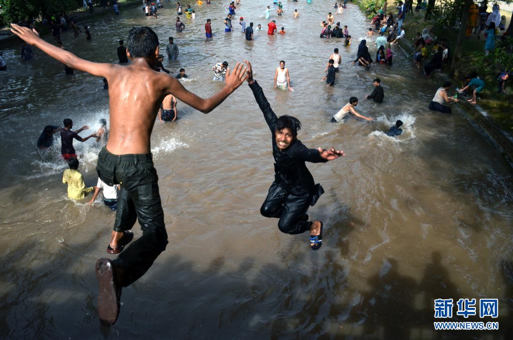 5月30日,年輕人跳入巴基斯坦城市拉合爾的溝渠中享受清涼。