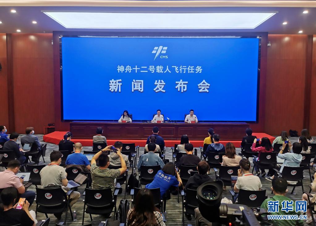 6月16日,神舟十二號載人飛行任務新聞發(fā)布會在酒泉衛(wèi)星發(fā)射中心召開(手機拍攝)。
