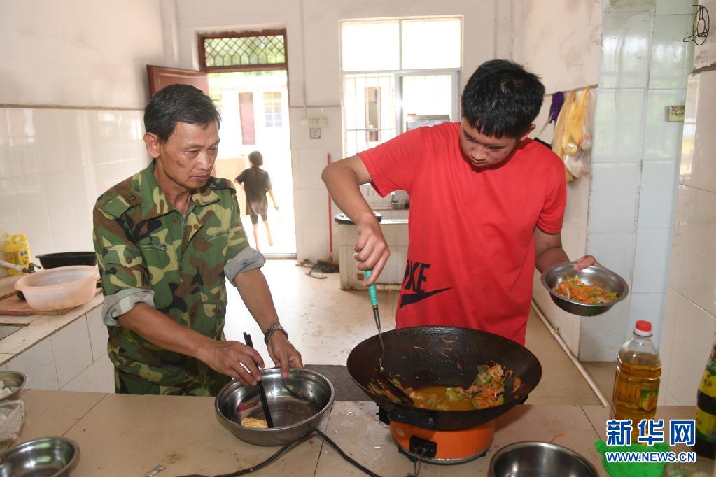 在廣西上思縣那琴鄉(xiāng)中心小學(xué)逢通村教學(xué)點(diǎn),梁志雄老師在教一名學(xué)生盛菜(6月16日攝)。新華社記者 陸波岸 攝