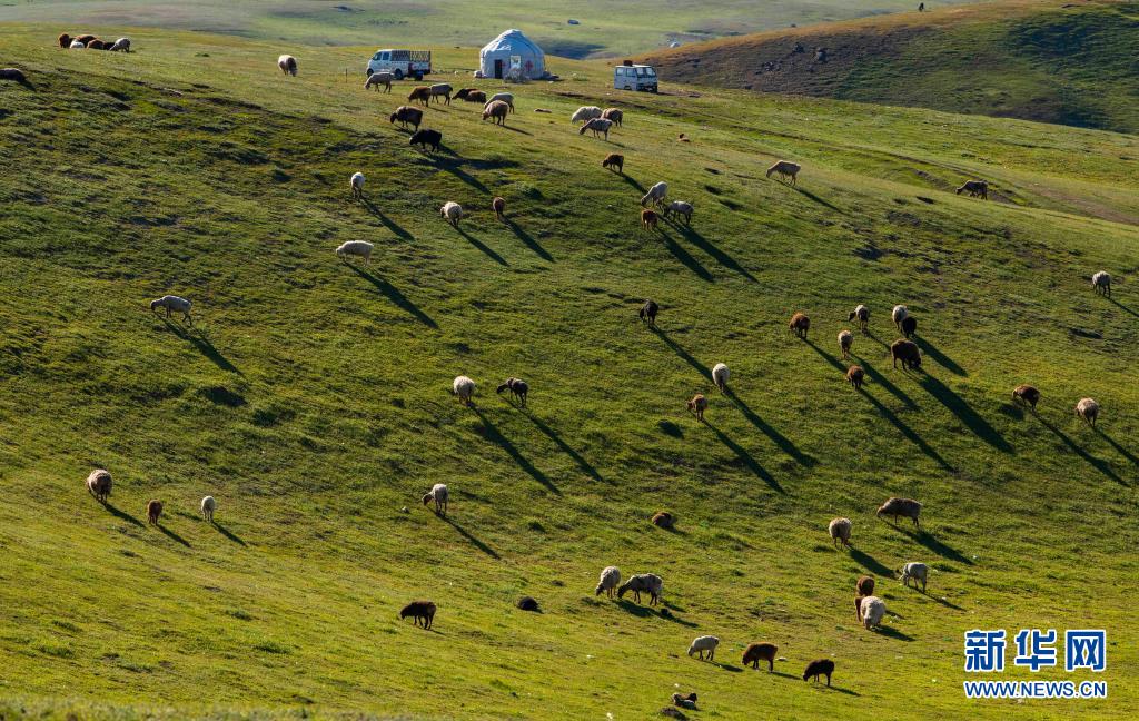 新疆裕民縣巴爾魯克山區(qū)夏牧場上的羊群、氈房、汽車(6月14日攝)。