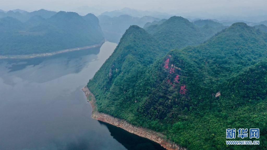 江界河“烏江天險(xiǎn)”石刻(5月20日攝,無(wú)人機(jī)照片)。新華社記者 歐東衢 攝
