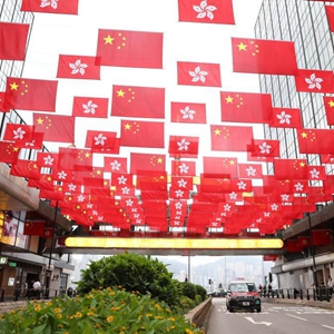 6月29日,在香港尖沙咀一條街上,中華人民共和國(guó)國(guó)旗和香港特別行政區(qū)區(qū)旗一起迎風(fēng)飄揚(yáng)。