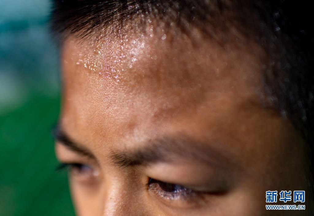 塔城市第二小學曲棍球隊的一名小隊員在訓練間隙休息(6月11日攝)。