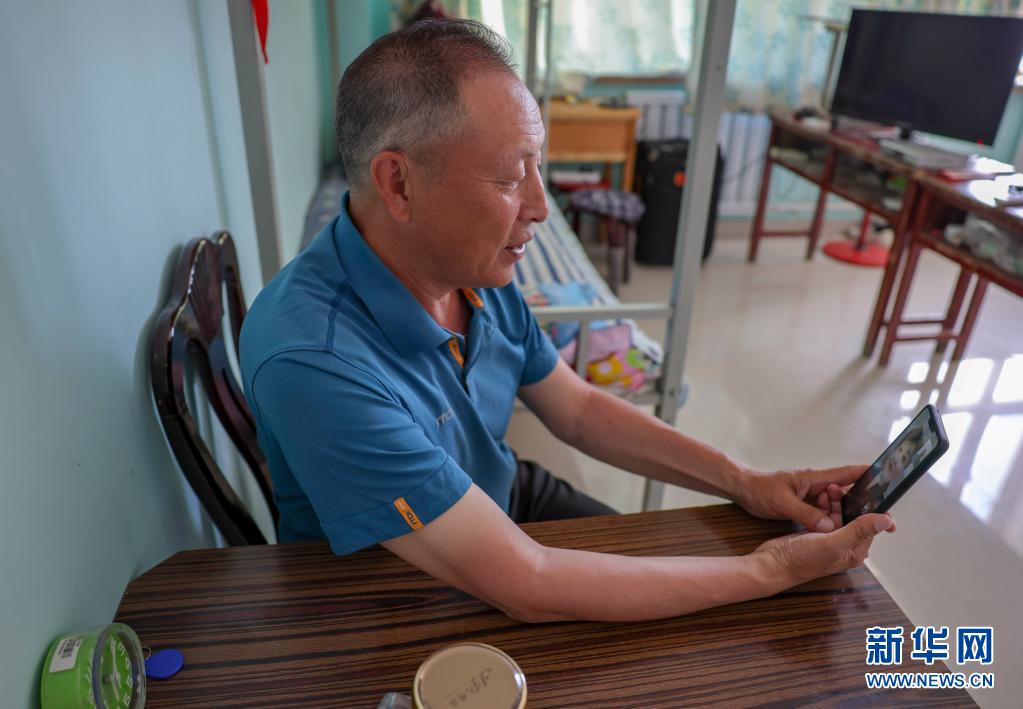 杜寶柱在塔城市第二小學(xué)宿舍內(nèi)和遠(yuǎn)在內(nèi)蒙古的家人視頻聊天(6月12日攝)。