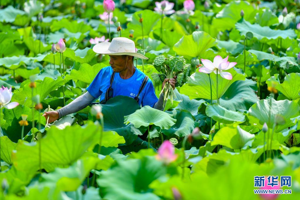 7月11日,在湖南省湘潭市雨湖區(qū)姜畬鎮(zhèn)聯(lián)映村,蓮農(nóng)在荷塘采摘蓮蓬。新華社記者 陳澤國 攝