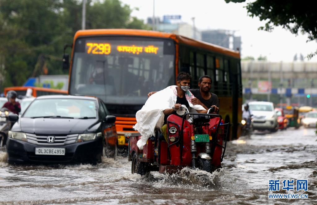 7月14日,車輛在印度新德里積水的街道上行進。