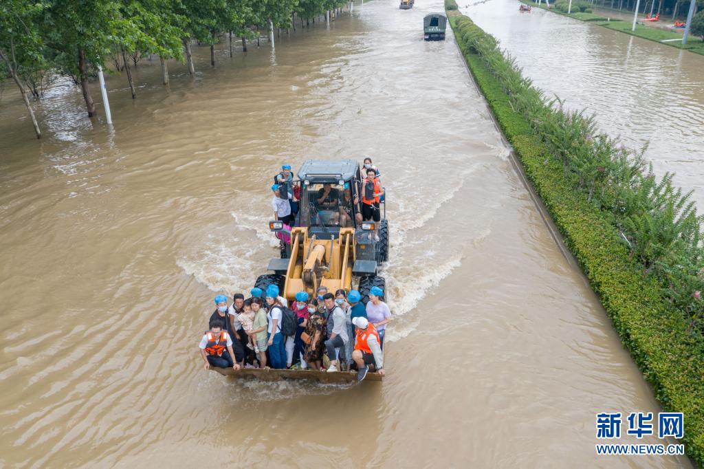 7月22日,在阜外華中心血管病醫(yī)院附近的錦繡路與鄭開大道交叉口,救援人員利用鏟車轉移人員(無人機照片)。