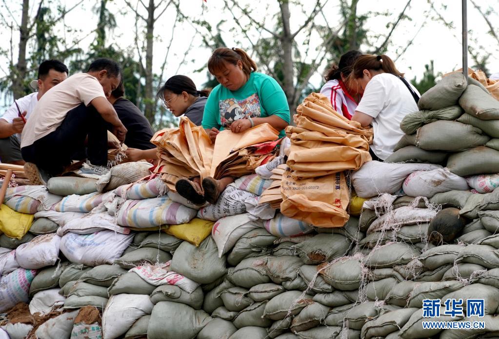 7月29日,群眾在??h傅莊堤上為救援人員準(zhǔn)備沙袋裝沙。