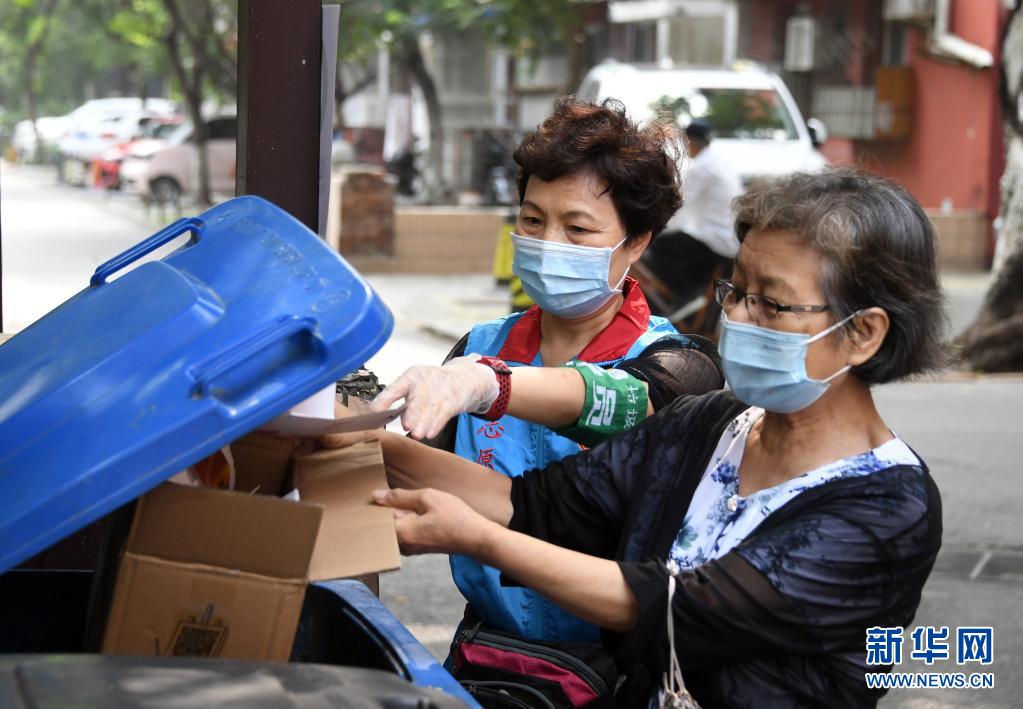 在北京市海淀區(qū)薊門里社區(qū),董星梅(左)指導(dǎo)社區(qū)居民進(jìn)行垃圾分類投放(8月11日攝)。